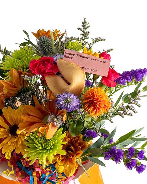 A great surprise for all birthdays. Birthday Blast arrangements are loving created in an adorable take out box with splash of confetti filling. Each arrangement includes a delicious fortune cookie with your sweet message inside. Birthday Blast arrangements are gift wrapped in an orange organza bag and shipped nationwide! So fun