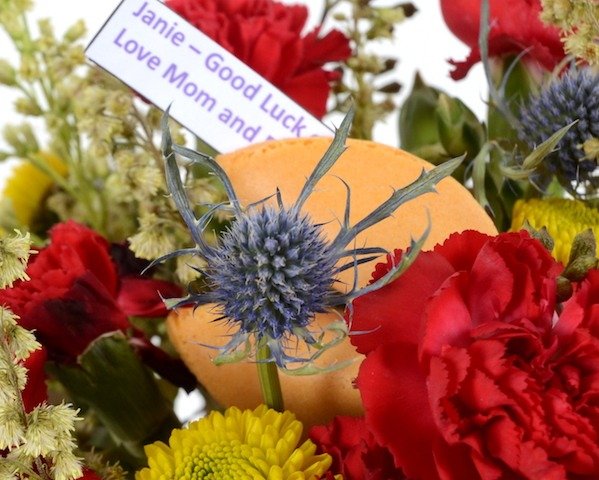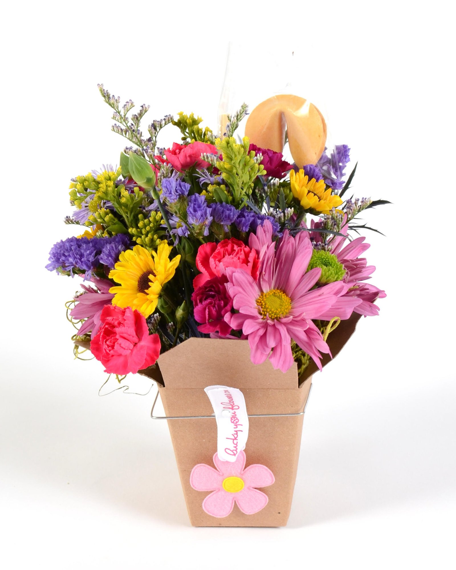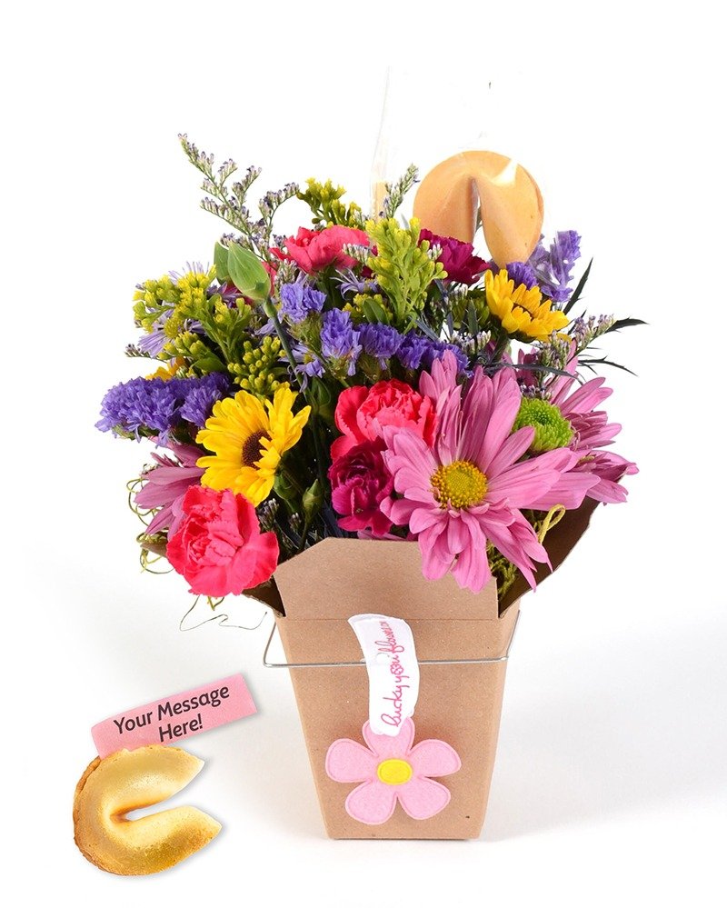 Professionally arranged flowers in an adorable take out container, each gift wrapped in a pink organza bag. Each arrangement is unique and includes a personalized message in a plain fortune cookie. Guaranteed to make everyone smile. Lucky You Flowers – a gift that blooms with love and purpose!