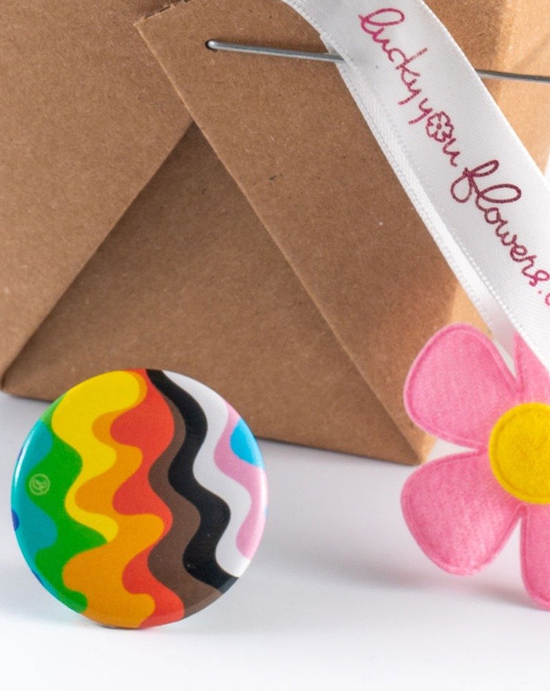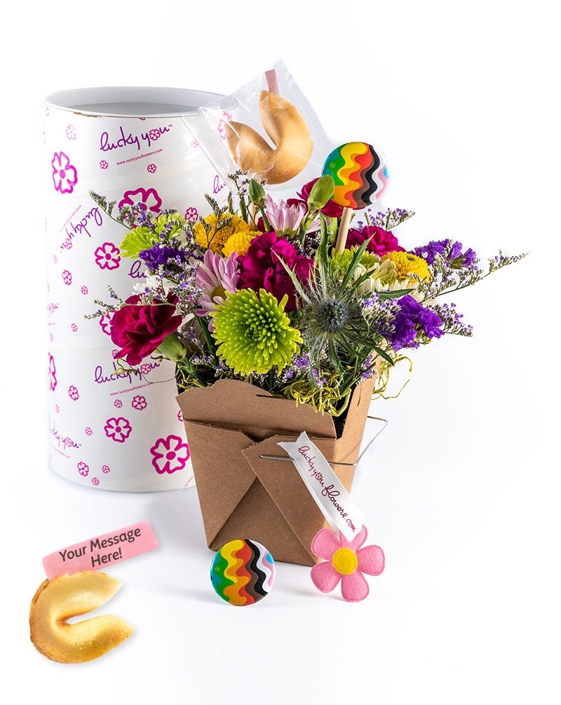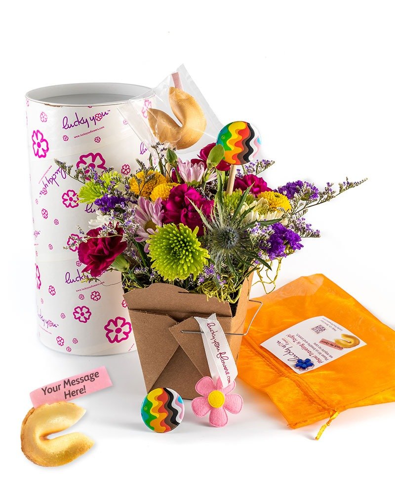 Pride – Celebrate everyone this month. Professional arranged flowers in an adorable take out container. The Pride Lucky You includes a unique Pride pin designed by Bianca Designs – @biancadesigns. Every Lucky You arrangement includes a fortune cookie with your message tucked inside! Wrapped in an orange organza bag and shipped nationwide!