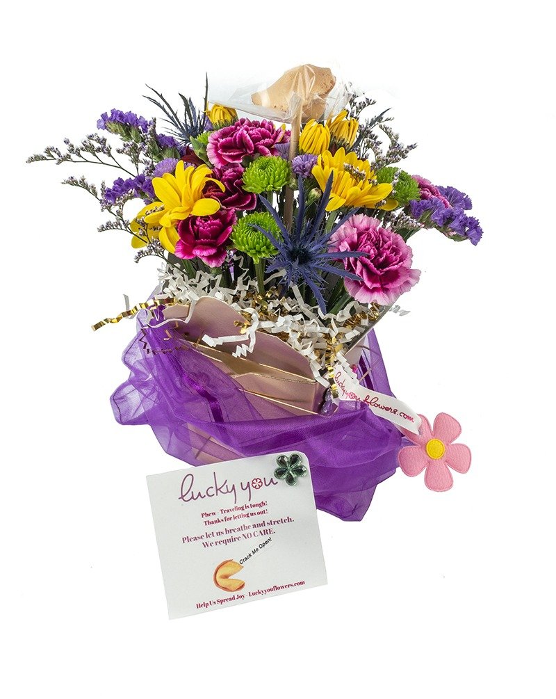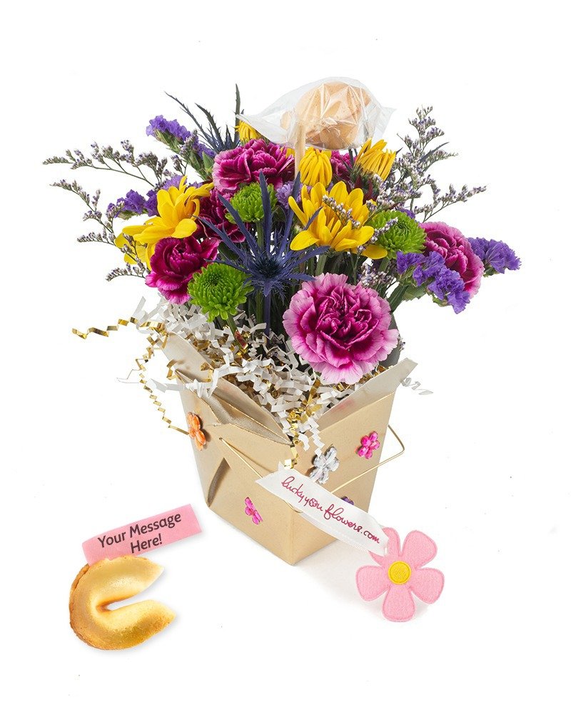 Get your royal on…  Send a Lucky You to someone who could use a little “royal treatment”.   An adorable gold container encrusted with “Gems”. The Crown arrangement includes a fortune cookie with your message tuck inside and is gift wrapped in a purple organza bag – so regal!   Great for all celebrations and occasions.
