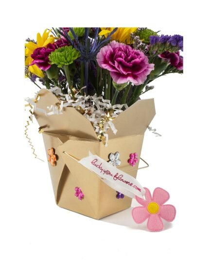 Description Celebrate love with this adorable arrangement.  Fresh flowers professionally arranged in an organic kraft take out box stamped with cheery